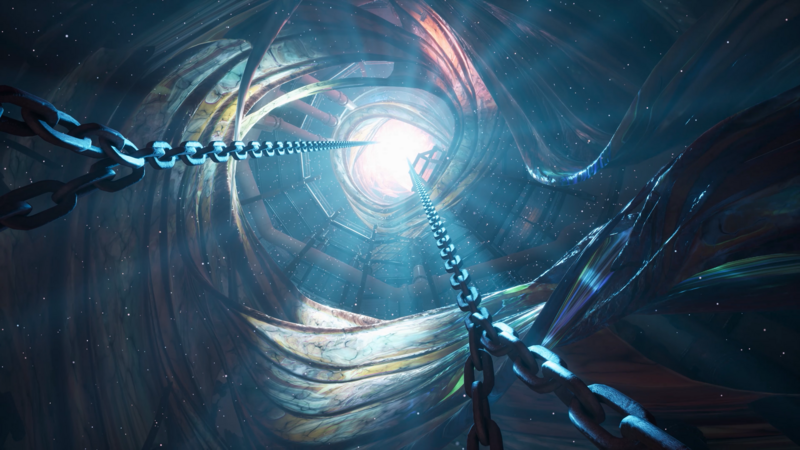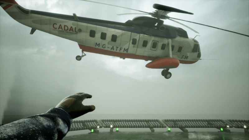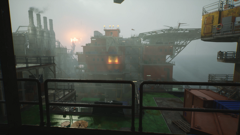 For the reveal trailer, we wanted to introduce the harshness and loneliness of the game’s environment. Working from the vision shared with us by the team at The Chinese Room, the opening hook of this trailer is a slow, ominous shot across the expansive ocean as we creep closer to the rig. For this we worked with the ocean system of the game build, framing the shot just as we wanted and enhancing the environment with VFX. After slowly revealing the imposing presence of the rig itself, we juxtaposed this with quick cuts of cinematic and gameplay scenes, hinting at Caz’s claustrophobic navigation of it.