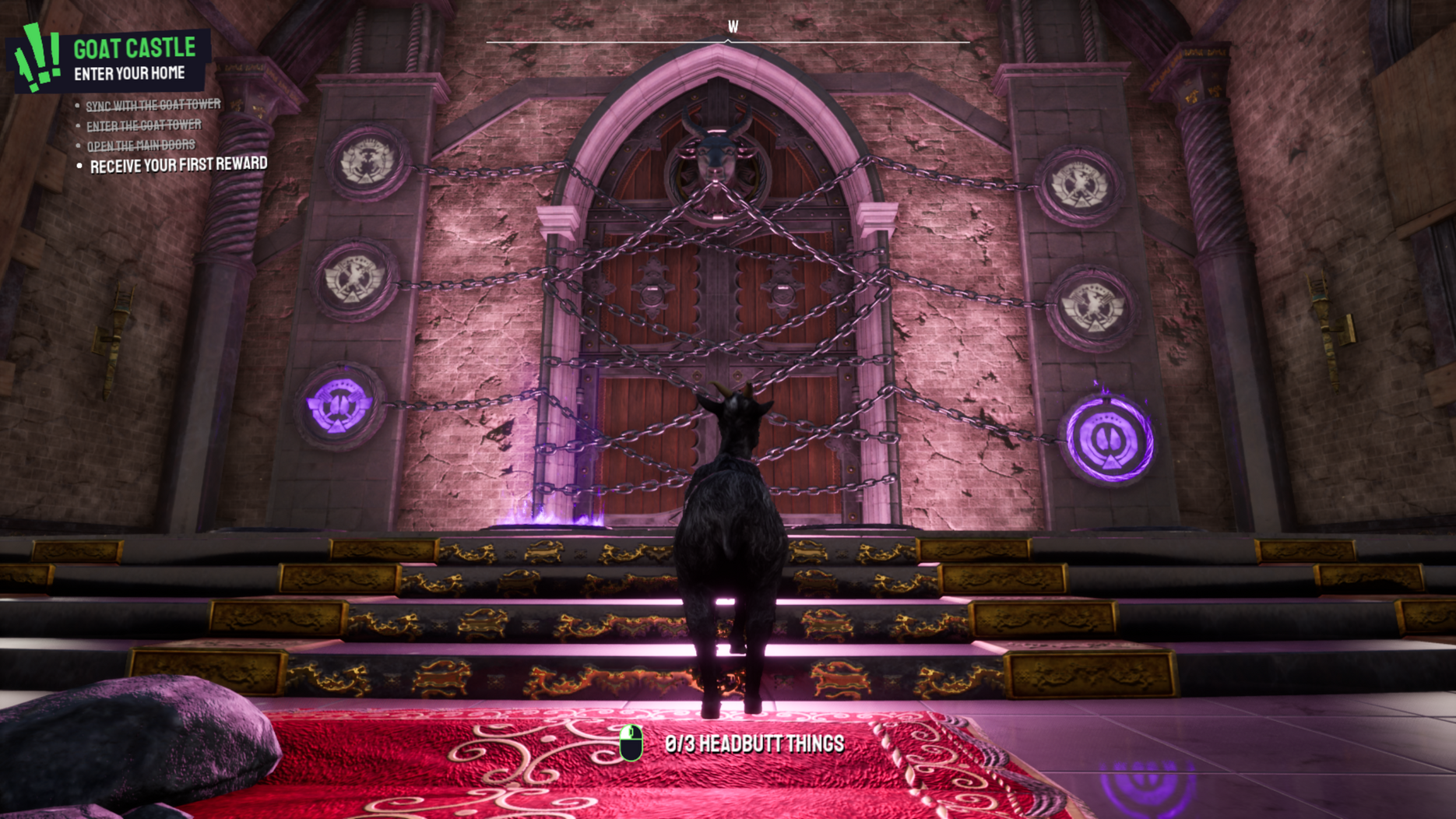Goat Towers provide players with optional guidance, goals and story, without reducing that all-important player agency. By performing various activities in the game world, players receive ‘Illuminati Points’, and gradually unlock medallions on the Goat Tower’s progression wall. Players can engage with Goat Towers when they see fit.